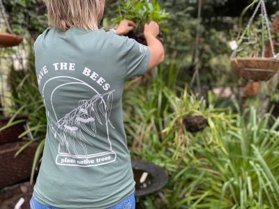 The Pollinator Fan Club Tee by Georgia Downie celebrates nature’s helpers with a charming design. Available in Sage Green or Moss Green, sizes XS to XL.