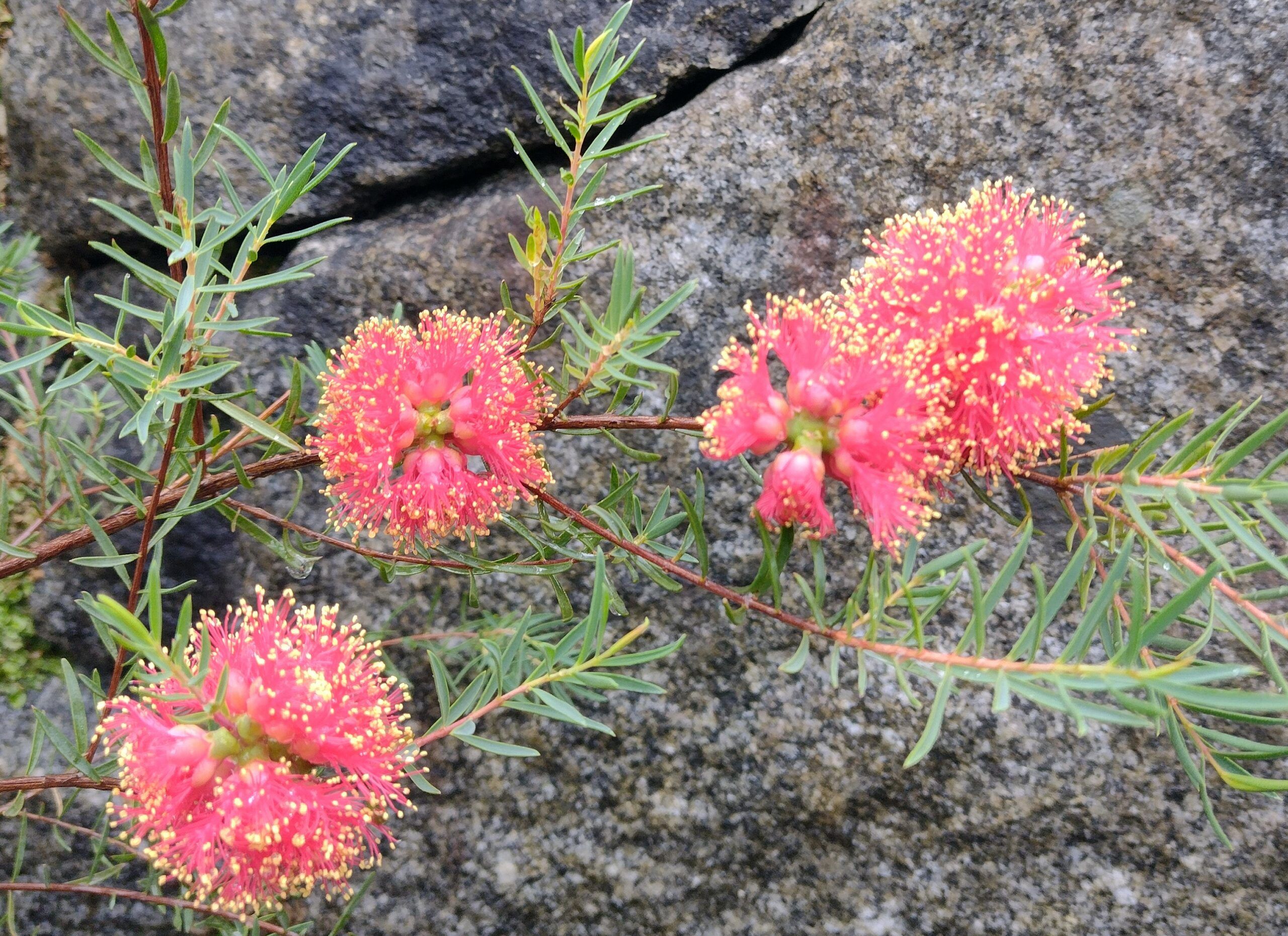Low-growing form; orange flower brushes in S-Au.  Bird attracting.