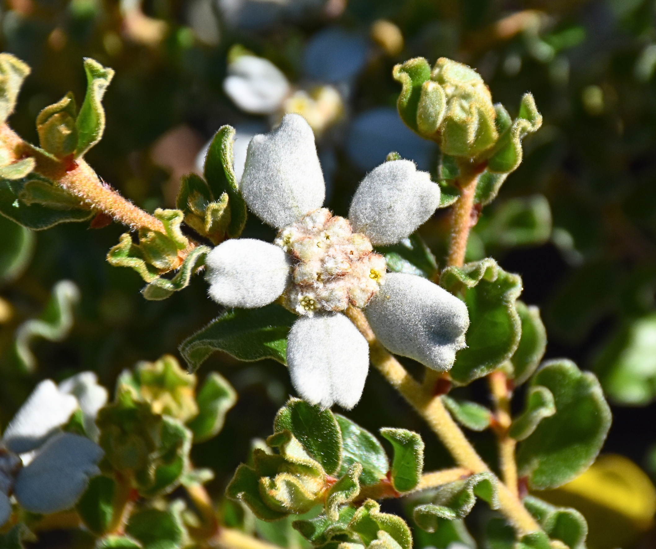 Spyridium coactifolium is a compact and showy shrub native to South Australia. Spyridium coactifolium features soft fury leaves and small flower heads surrounded by white floral bracts, giving the appearance of butterflies resting on the plant. Flowering over a long period from late winter into spring. Best grown in well-drained soils with low to moderate water needs. Drought and light frost tolerant once established. Ideal for coastal gardens and textural plantings. Light pruning maintains a tidy form.