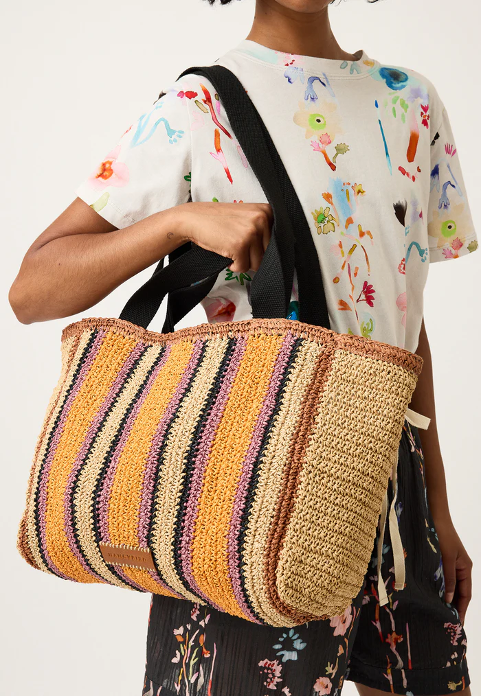 A stunning artisan made carryall tote with hand crocheted raffia body in a stripe design. Short and long handles provide multiple ways of wearing.