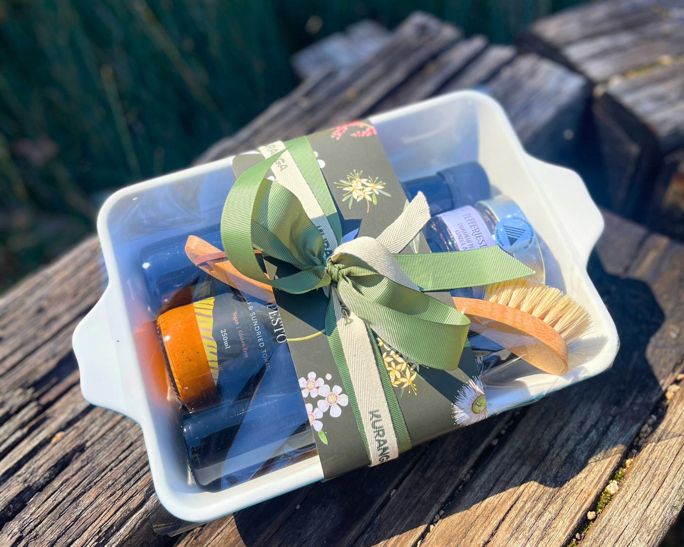 Inspired by gatherings around the table, the Bushland Bloom Dish Hamper brings together a beautiful balance of native flavour and everyday elegance. Presented in a reusable medium baking dish, this collection features artisan balsamic vinegar, native-infused dipping oil, Tasmanian dukkha or salt, a gourmet pesto or tapenade, and a mini native condiment, each carefully chosen to complement the Australian table. Finished with a natural dish brush and tea towel, it’s the perfect gift for food lovers who appreciate quality, flavour, and the beauty of slow living.