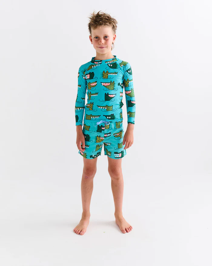 Our Crocodile Rock Green Rash Vest is a must-have summer essential. Featuring snappy and smiley little green crocs on a green blue base, this rashie is made from recycled polyester and spandex with UPF 50+ protection. Comfy, colourful, and sun smart, it keeps little legends covered while they chase waves and sunshine all summer long.