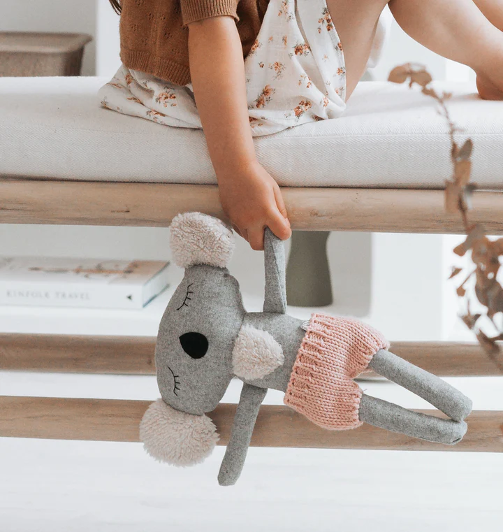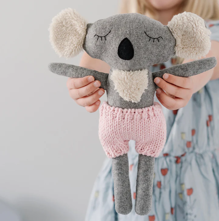 The adorable Dorothy the koala is made with the softest wool blend fabric. She comes dressed in knitted Australian merino wool pink pants and has the softest ears, making her perfect for cuddling,  She loves singing in the rain and collect autumn leaves, especially with her best friend Fergus.