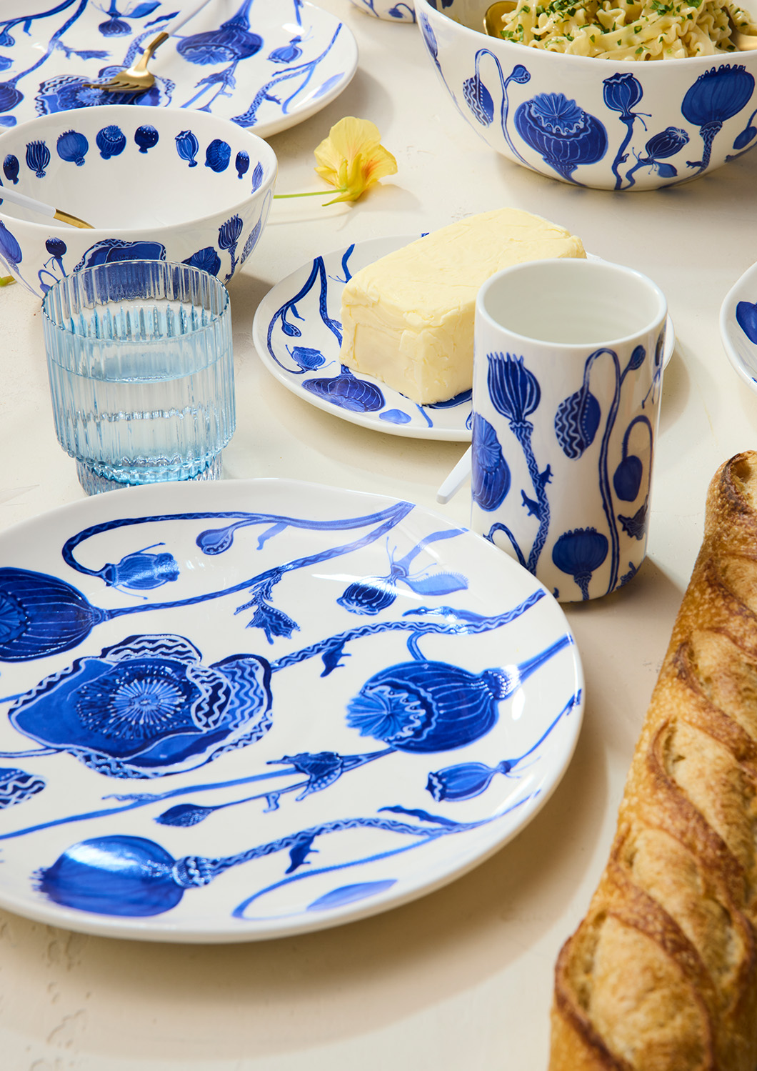 Celebrating our signature A&C ultra-bright Klein Blue in ceramic surface print, this new dinner service captures the intricate beauty of the wild poppy. A resilient bloom, known for springing to life so effortlessly from seed! For lovers of our ultra-vibrant blue, each piece showcases exquisite surface detailing, from the fine lines within the poppy’s stamens to the delicate texture of its seed heads.
