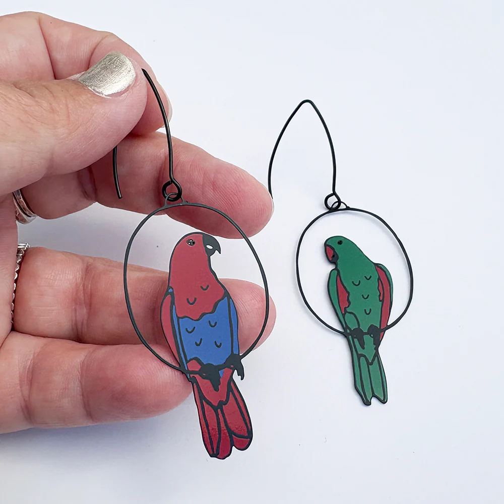 These striking earrings bring together the male and female of the Eclectus parrot species in one playful yet elegant pair. One earring features a bold red-and-blue female bird; the other showcases the vibrant green-and-red male. Each piece is crafted from super-thin recycled stainless steel with hypoallergenic hooks—offering featherlight comfort without compromising on impact. denzandco+1