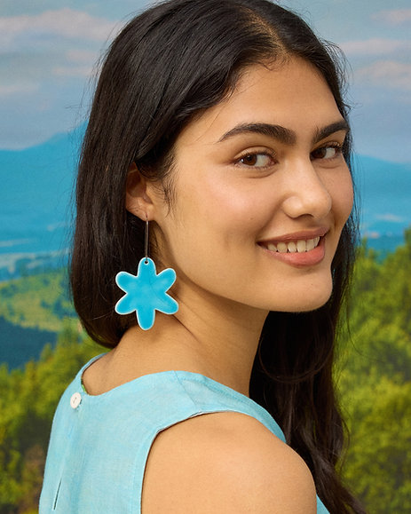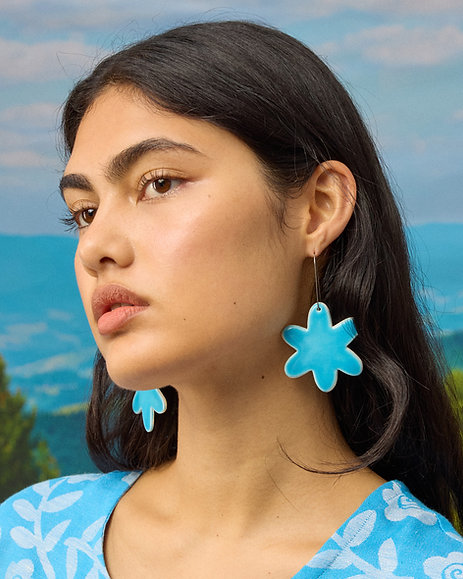 The Flowerburst earrings feature lightweight hand built ceramic pieces suspended on 35mm surgical steel hooks. This pair has been painted with a vibrant glossy blue glaze,