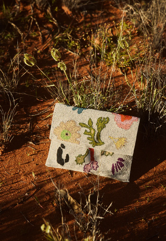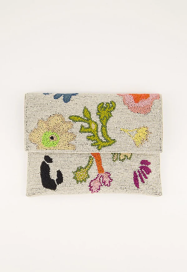 Artisan made using thousands of glass beads, this folded clutch is soft and slouchy, featuring our Watercolour floral design.