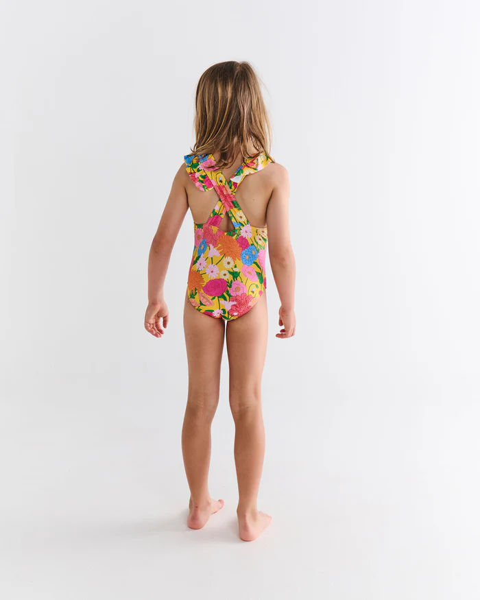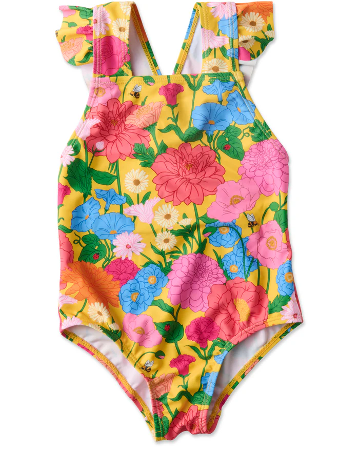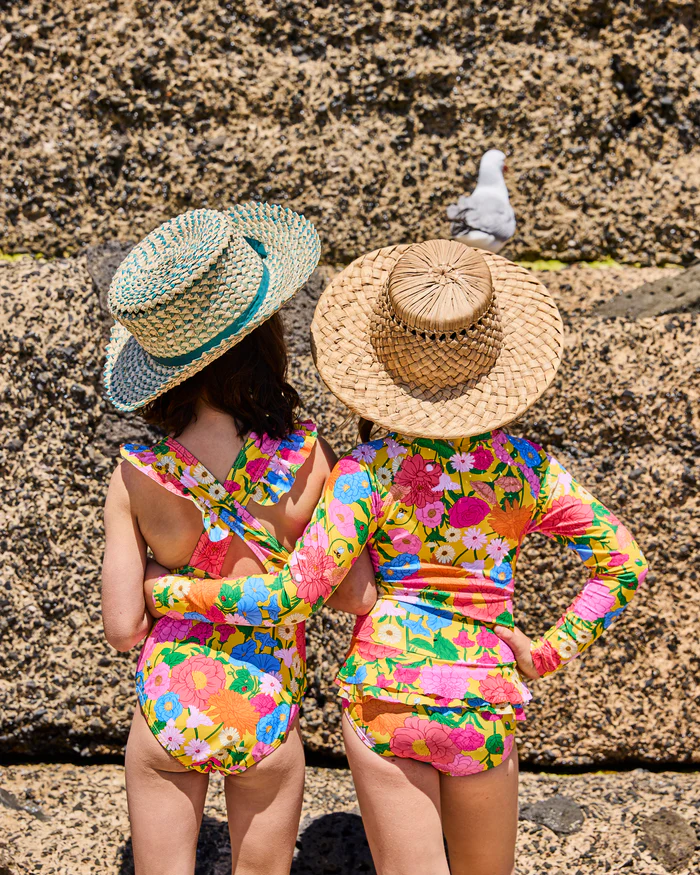 These Follow The Sun Yellow One Piece Bathers are soft, stretchy, and packed with UPF 50+ protection, making them the go-to for every little water lover this summer. Featuring hand-drawn florals in shades of pink, orange and cornflower blue, dotted with friendly little bees and lady beetles on a golden yellow base, these bathers are made for big dives, belly flops, and endless laps around the sprinkler!