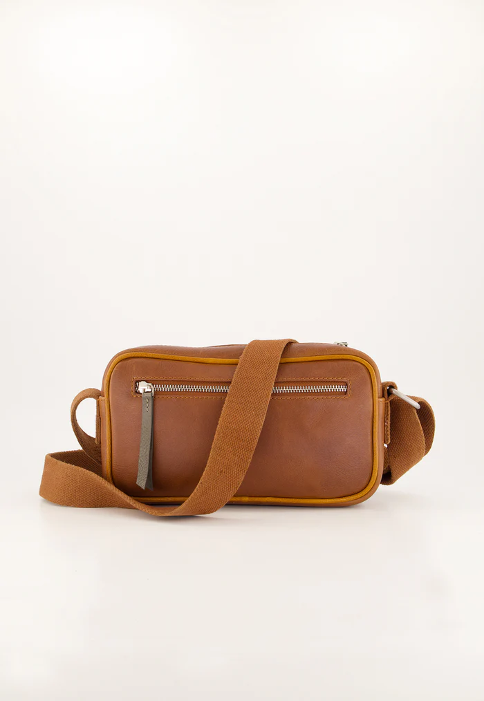 The vegetable tanned cow leather bag featuring a woven cotton adjustable crossbody strap, front zipped pocket, Inside open and zip pocket and crafted in GOTS certified organic printed cotton lining.