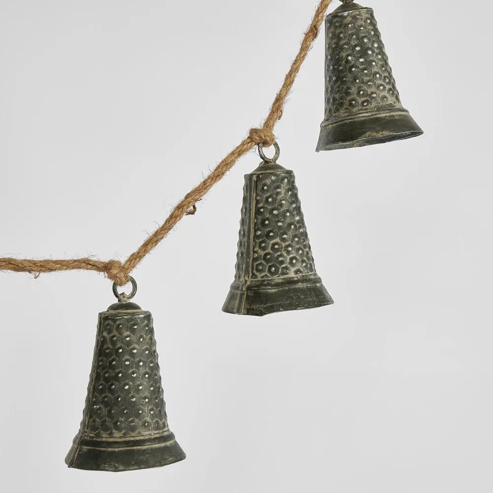 This stylish garland features iron bells finished in a deep charcoal patina, each strung on a natural cord to create a refined vertical or horizontal accent. With approximate dimensions of 7 cm diameter bells x 89 cm length, it’s designed to drape easily across mantelpieces, stair rails, doorframes or layered amongst foliage.