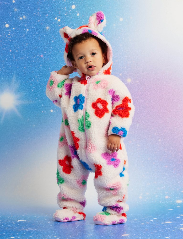 Features an oversized fit with drop shoulders, a two way zip for easy nappy change access, a fun colour splicing design and a pair of cheeky kangaroo ears atop the hood. And Boucle Applique design from our Hej Blomma! collection.