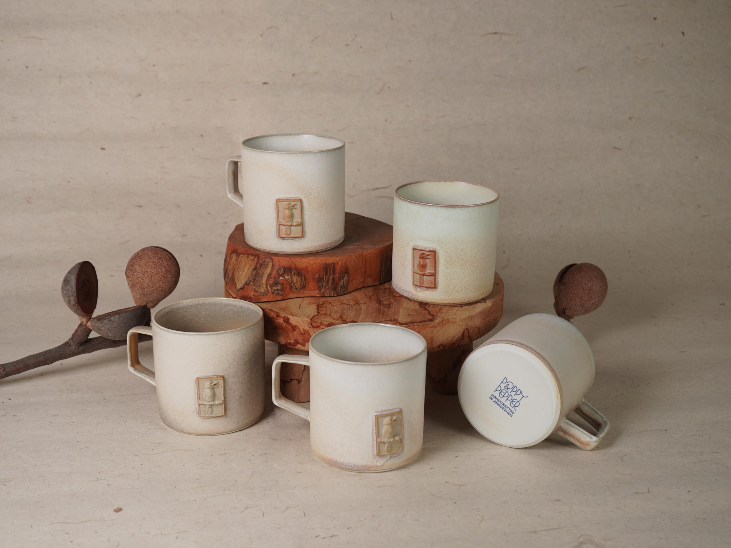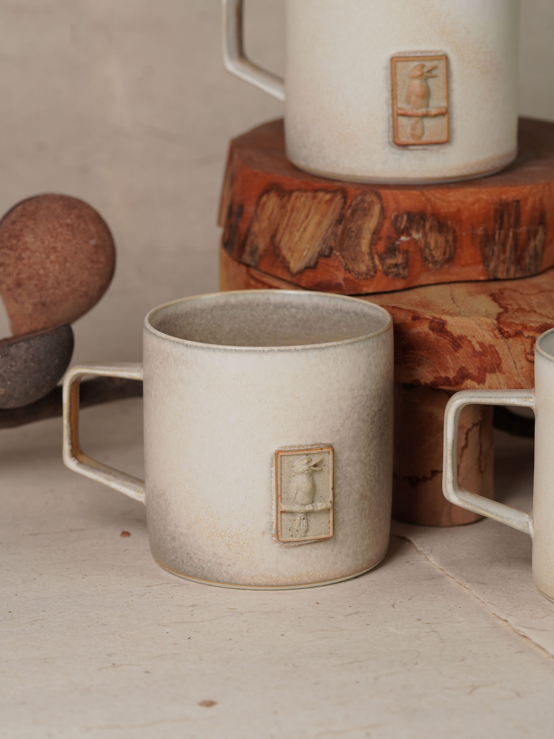 Each Australian animal mug is hand thrown with either clay or porcelain; then hand glazed inside and outside with food-safe glazes. The tiles themselves are created using digital 3D sculpting and printing techniques, then moulded with clay, before being hand mounted to the mug; the tiles are unglazed.