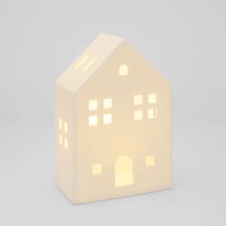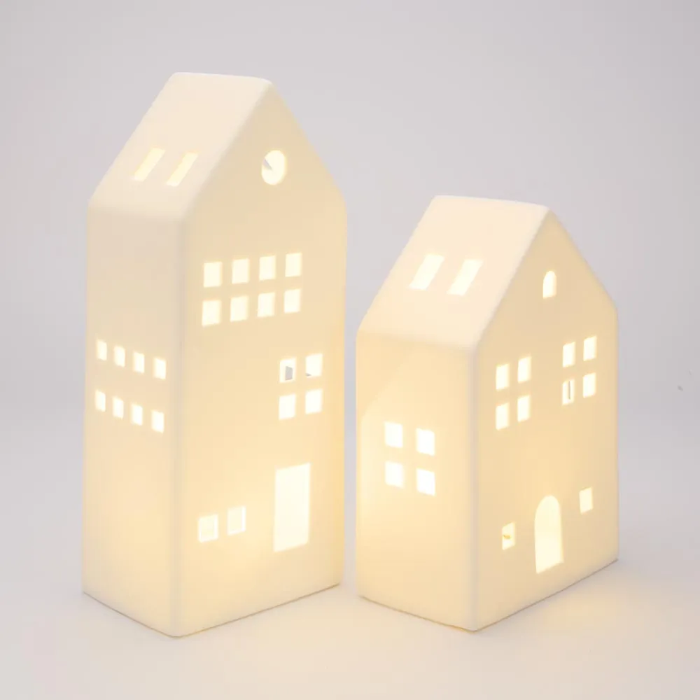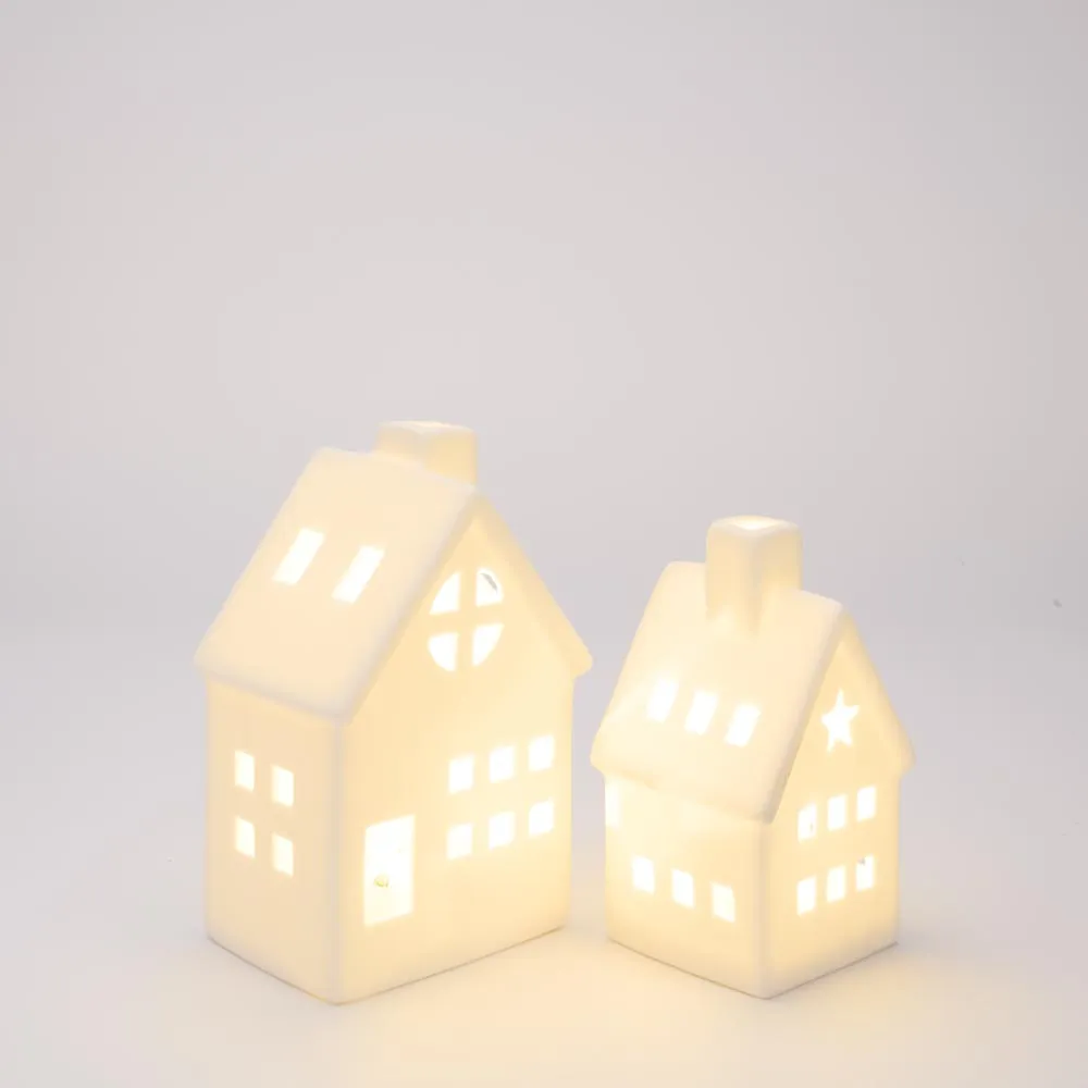 Crafted from delicate white porcelain, each house features a soft built-in light and charming chimney detail, creating a cosy and timeless display. Available in four sizes, these pieces can be styled individually or grouped together to form an enchanting porcelain village.