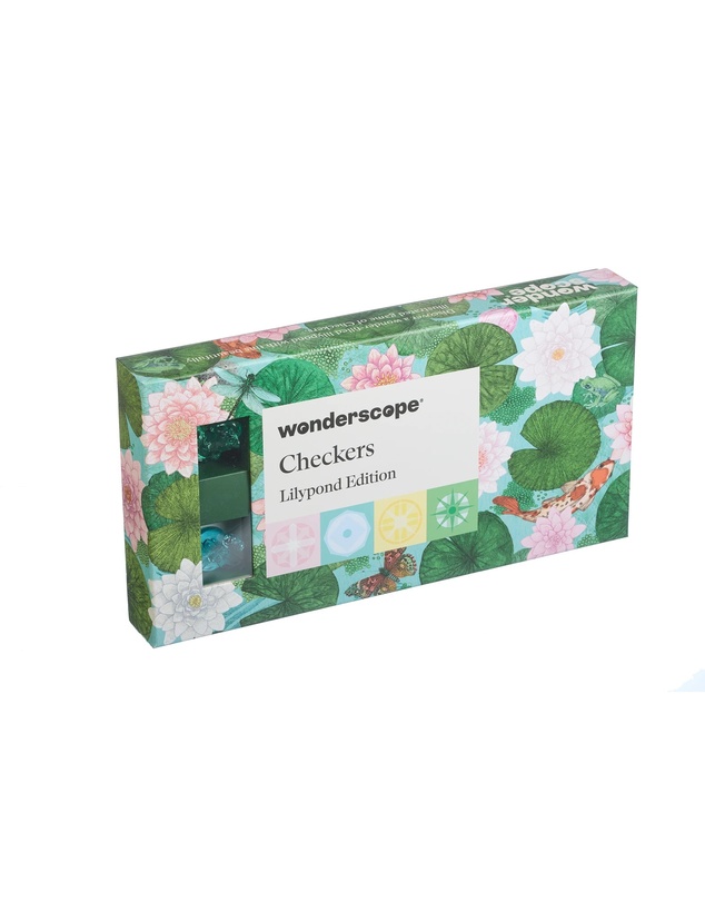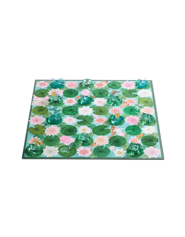 Discover a wonder-filled lilypond with this intricately designed game of checkers. Green frogs and dragonflies move across the pond in traditional checkers rules, with those reaching opposite sides to become crowned as Kings! Add their crown to extend their playing capabilites to become king of the lilypond!