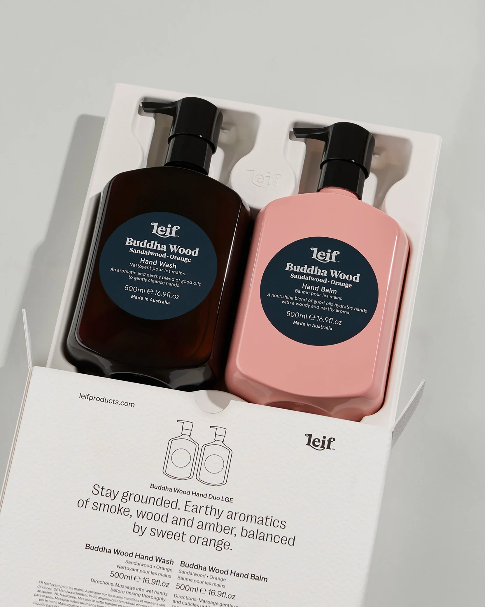 Inside the beautifully boxed set, you’ll find Leif’s signature Buddha Wood Hand Wash and Hand Balm in generous 500ml amber bottles. Crafted with native Australian ingredients, these formulas bring a touch of tranquillity to everyday rituals.