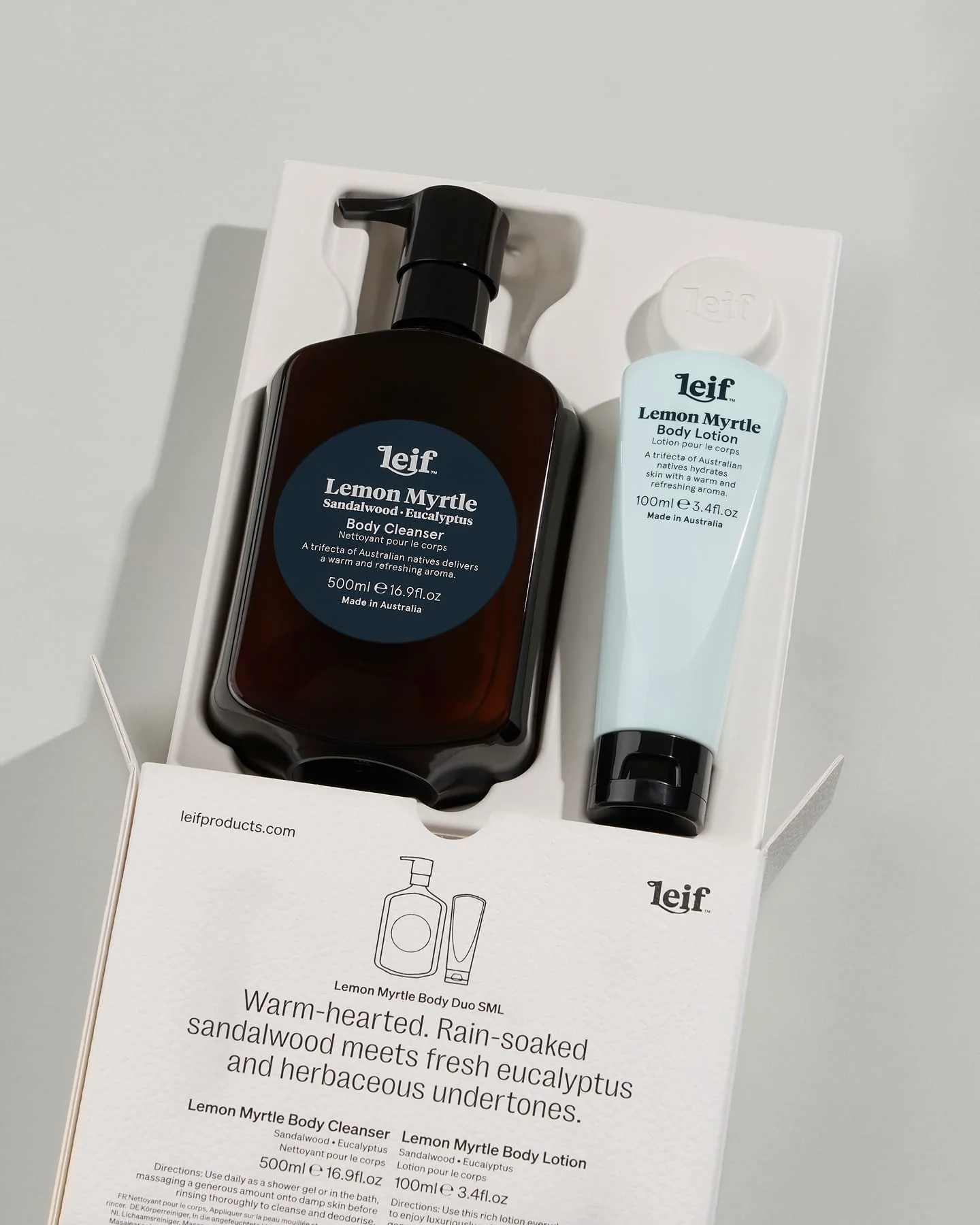 This beautifully presented duo pairs Leif’s Lemon Myrtle Body Cleanser and Body Lotion in convenient 250 ml amber bottles. Together, they celebrate the invigorating scent of native Lemon Myrtle — a botanical renowned for its crisp citrus aroma and natural antibacterial properties.