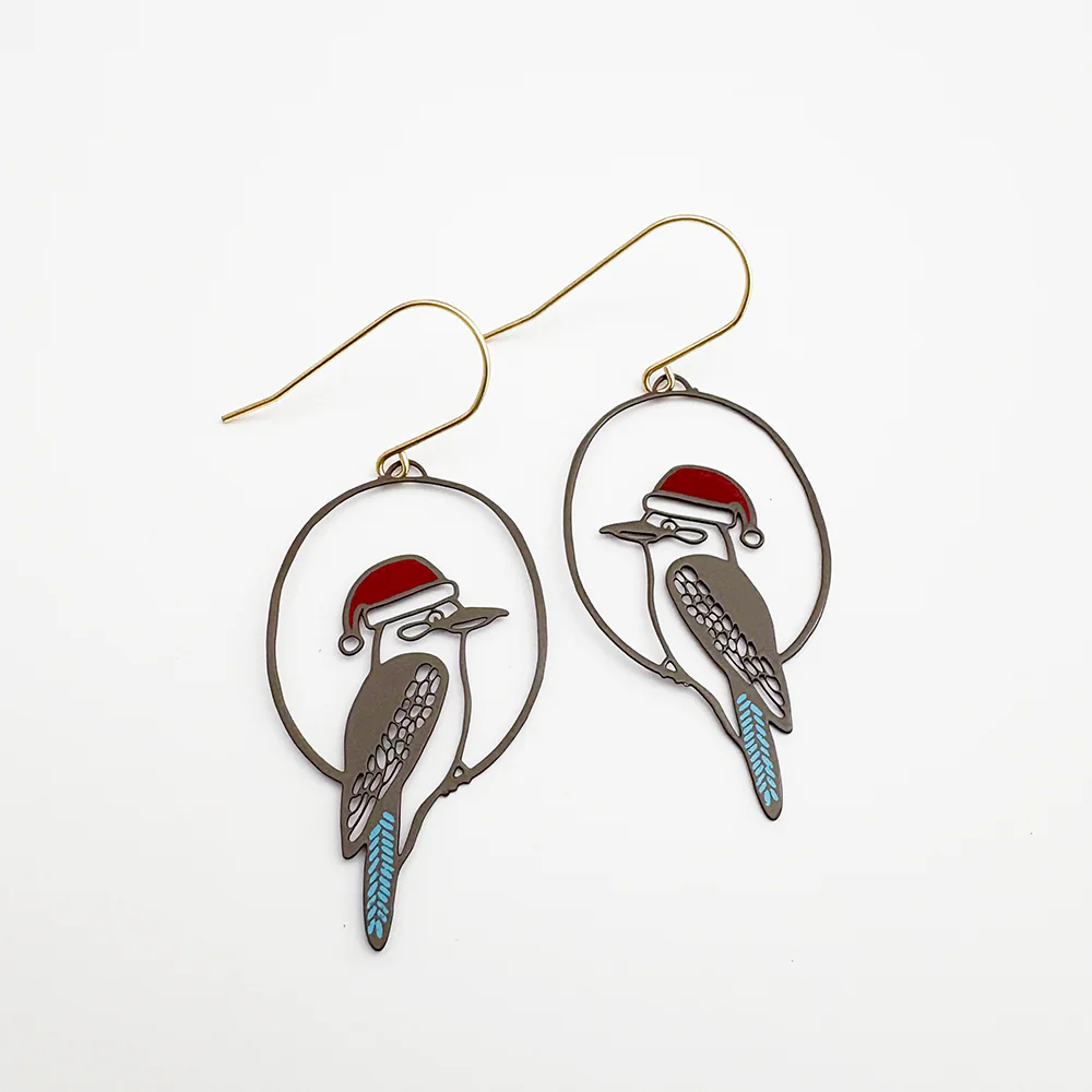 Cheerful, iconic, and oh-so-Aussie, our Midi Christmas Kookaburra Earrings are ready to laugh their way into your festive season. This playful design features a hand-drawn kookaburra perched inside a hoop, complete with soft brown and blue feather detailing and a bright red Santa hat. Made from super thin recycled stainless steel, they’re lightweight, hypoallergenic, and made for all-day wear, perfect for celebrating Christmas in true Australian style.