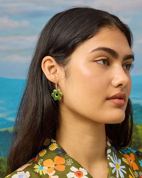 The Blossom Mini Hoop earrings feature lightweight hand built ceramic pieces suspended on 25mm sterling silver infinity hoops, painted with our speckled green gloss glaze.