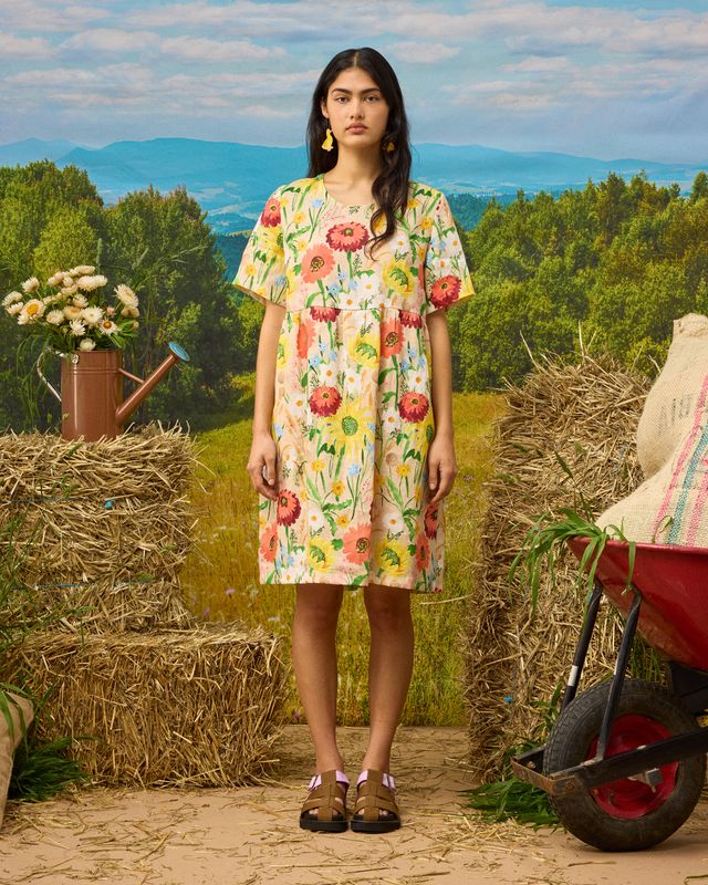 Handmade in Naarm / Melbourne this dress features our signature ‘Flowers at the Gate’ textile design digitally printed onto a linen and organic cotton voile. The Flowers at the Gate artwork captures overgrown blooms reaching up to the sky at the farm gate, in an oversized scale.