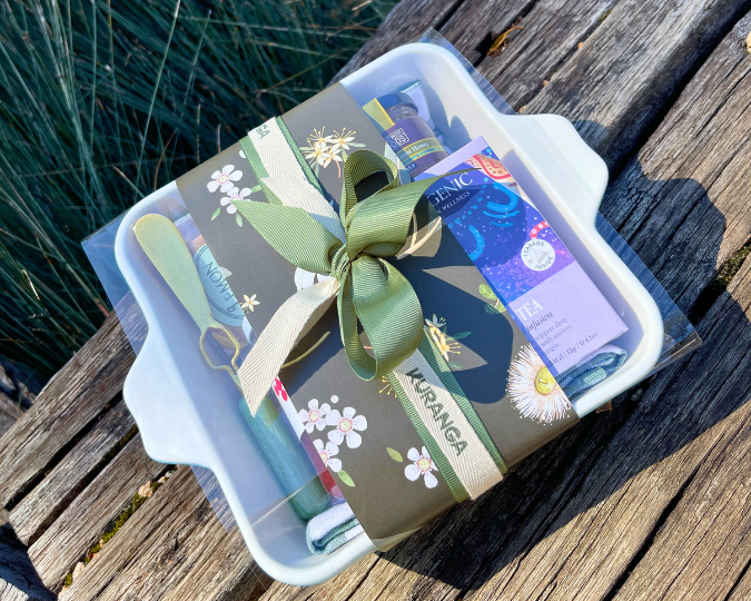 A thoughtful gift that celebrates the simple pleasures of home. The Native Nest Dish Hamper brings together the comfort of locally sourced flavours and timeless kitchen charm. Presented in a beautiful reusable baking dish, this collection includes native-inspired tea, local jam, creamy old-fashioned fudge, Australian honey, a quality cheese knife and tea towel, everything needed to create a cosy moment in the heart of the home. Perfect for a hostess gift, Christmas treat, or to share a little taste of Australia’s warmth and generosity.