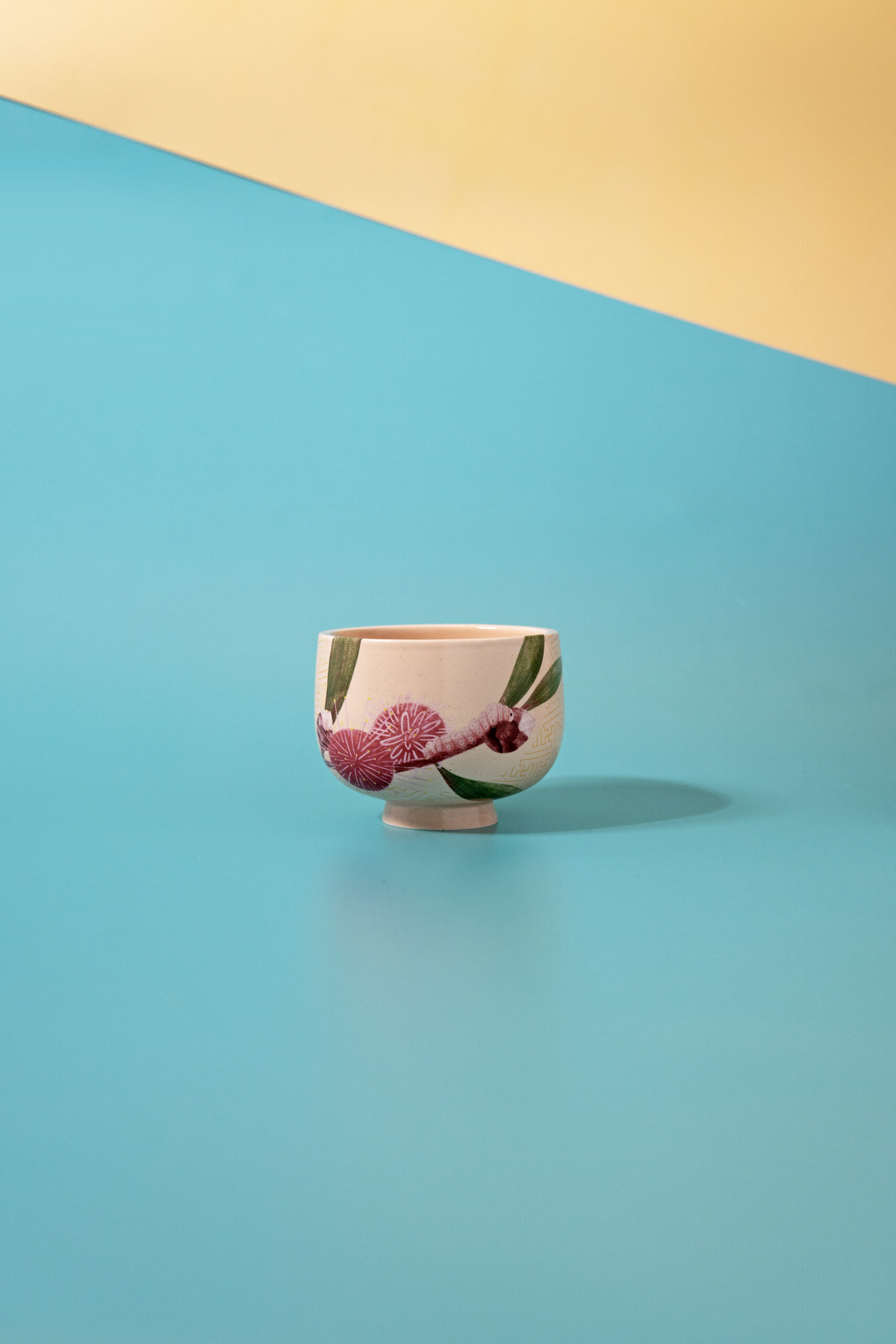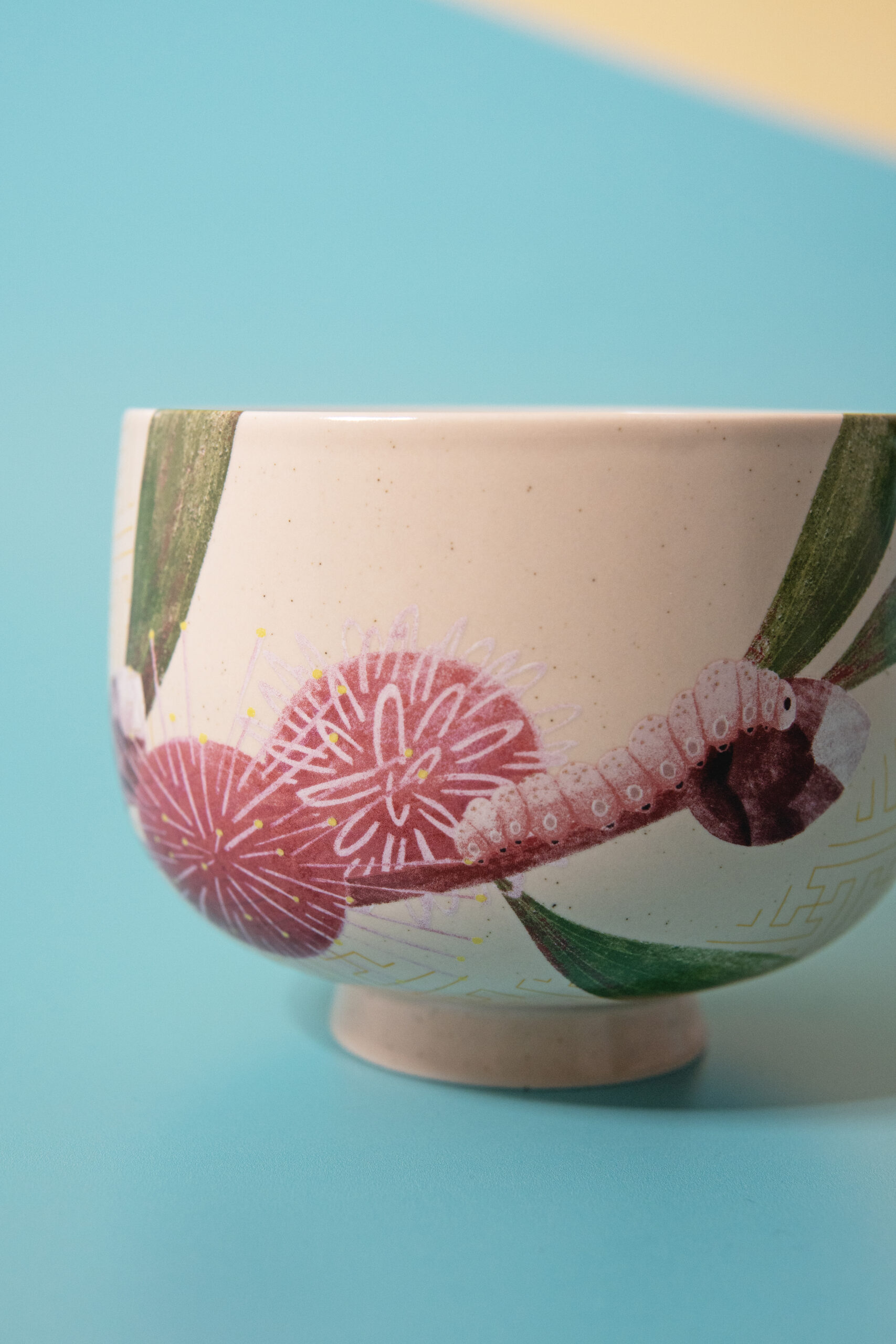 A pink caterpillar rests on a vibrant pincushion flower branch, elegantly framed by an imperial yellow Buddhism pattern. This unexpected yet harmonious combination adds a unique charm to our side bowl.