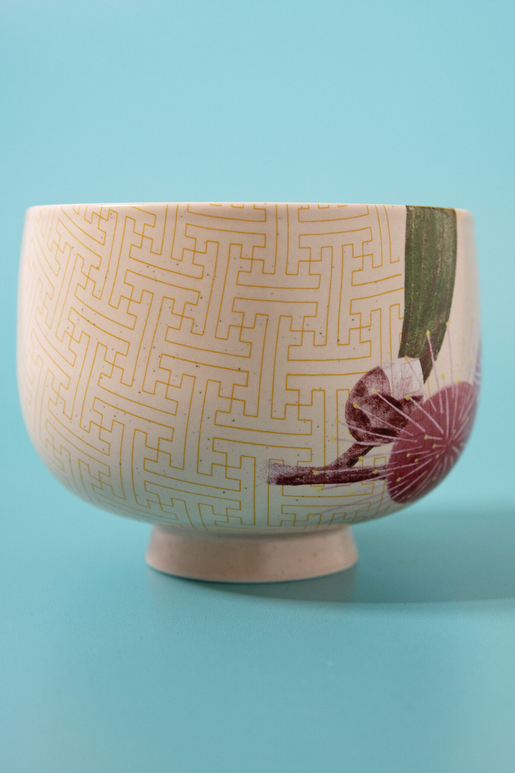 Our side bowl draws inspiration from a 1930s teacup and saucer, featuring an elevated foot and a gently inward-tilting edge. The bowl is adorned with a continuous pattern that frames delicate pincushion illustrations within a semi-window design. Leaves naturally flare out into the bowl, adding a charming touch.