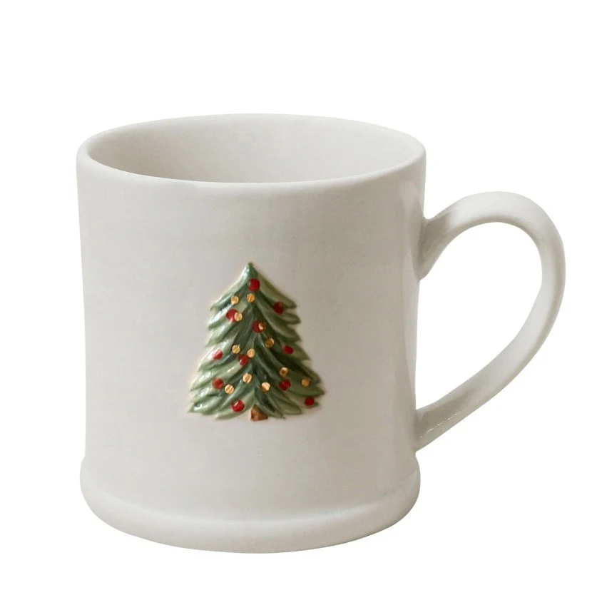 The white Christmas trees add soft elegance to mantelpieces and tablescapes, their matte glaze and sculptural shape reflecting Robert Gordon’s signature minimal design. The hanging tree bells feature a refined finish with gentle gold accents, creating a subtle sparkle that catches the light beautifully. Completing the collection, the Tree and Red Robin mugs combine festive illustrations with practical durability — perfect for your morning coffee or an evening cocoa under the twinkle of lights.