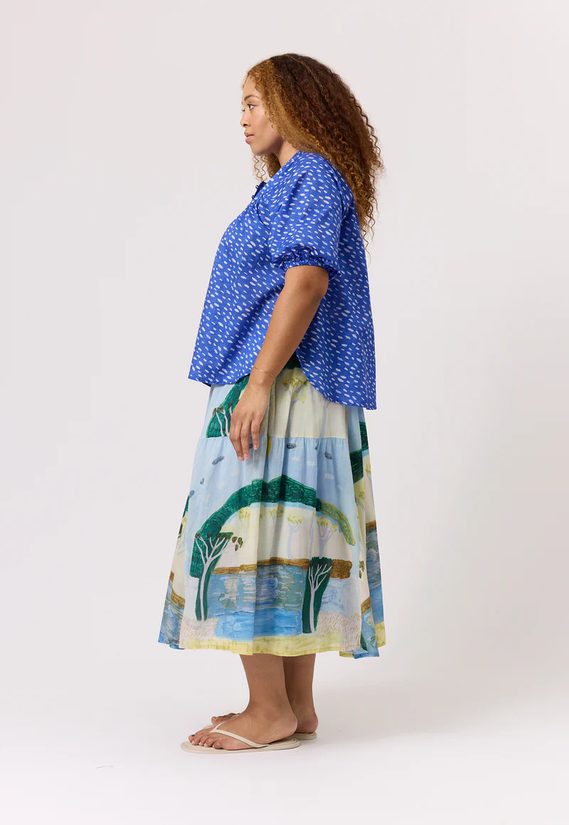 As summer emerges, this relaxed cotton voile blouse features soft gathering at cuffs and shell buttons at the front placket, and beckons you to shed those winter layers.