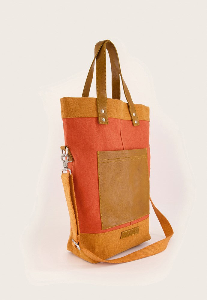 A thick organic cotton canvas bag featuring a bold orange red with rust orange contrasts. The straps can be worn multiple ways to fold the tote in half or be worn at full length.
